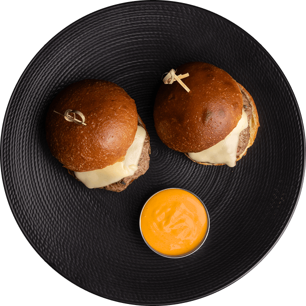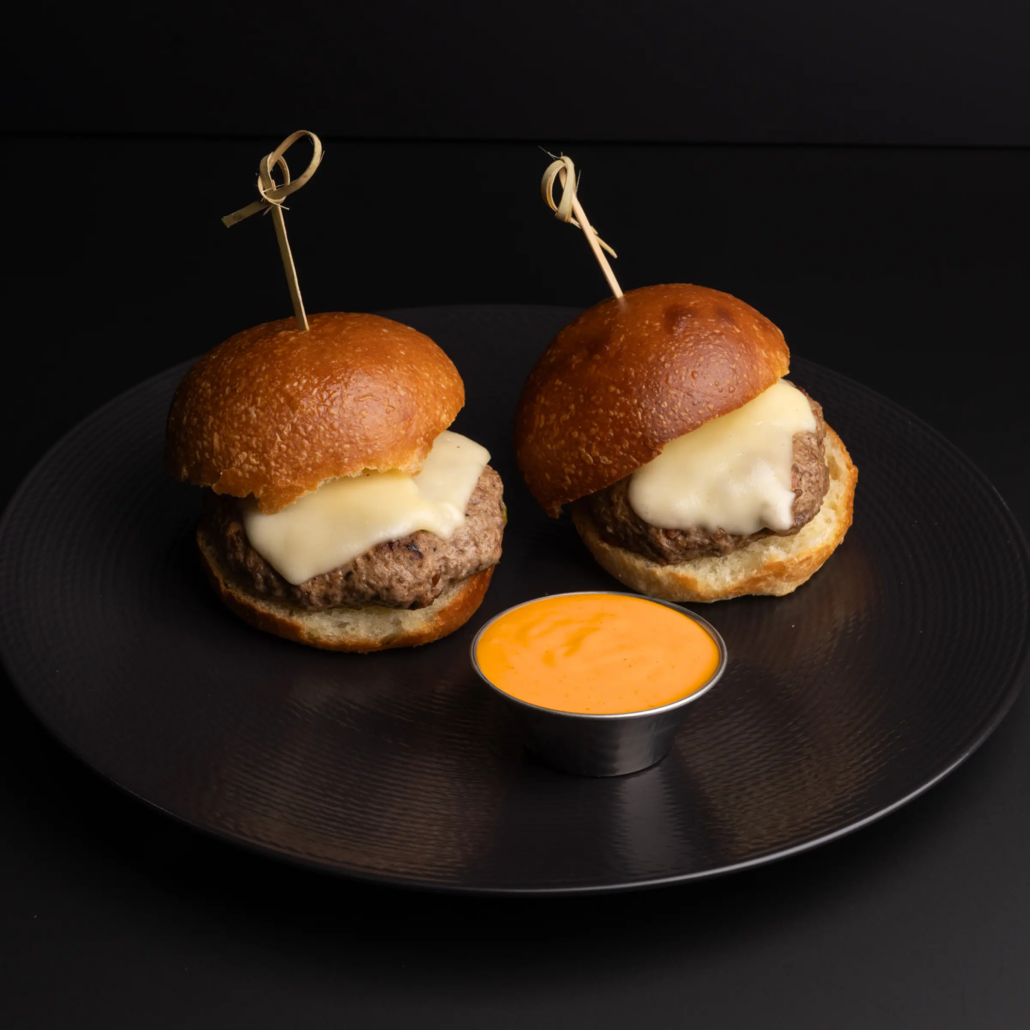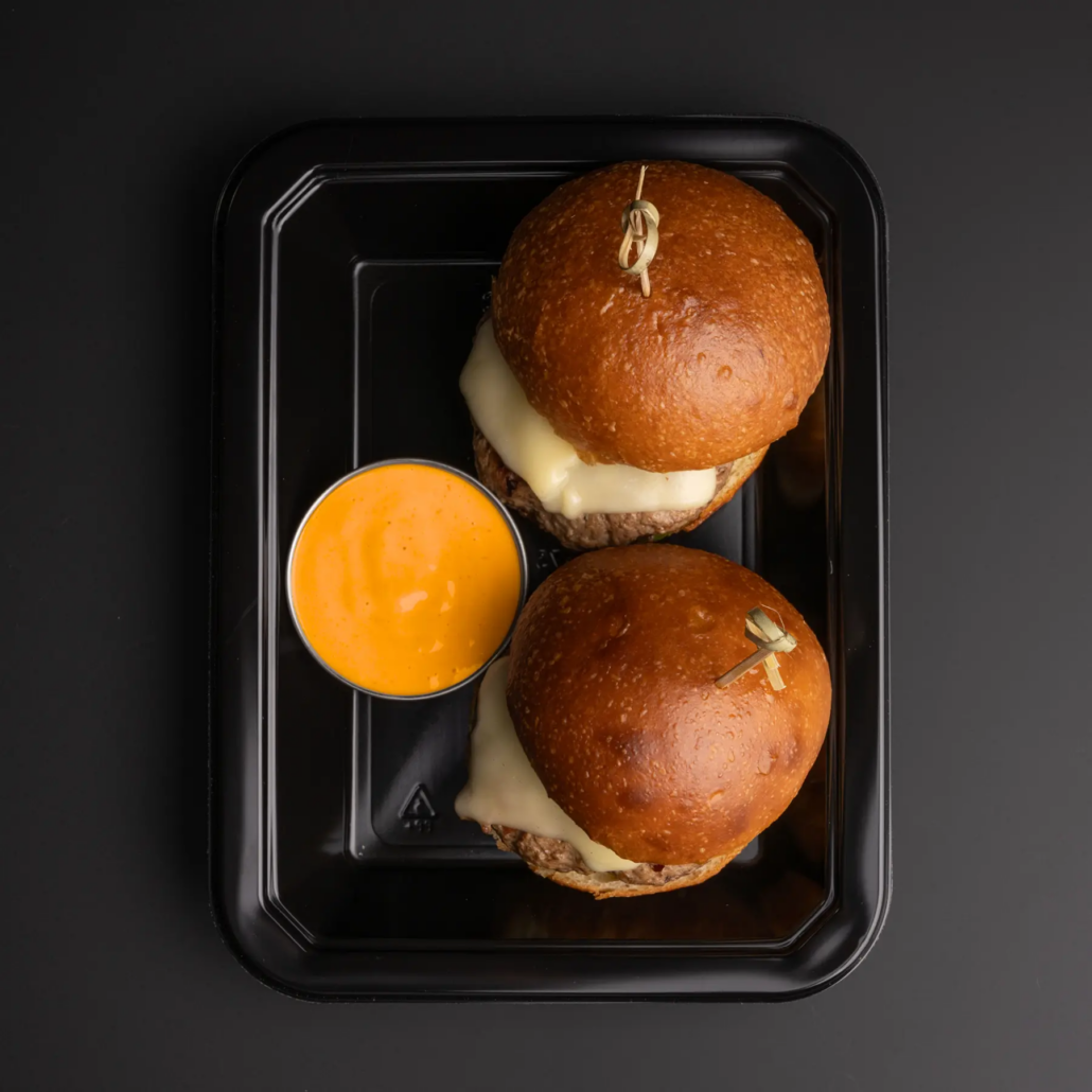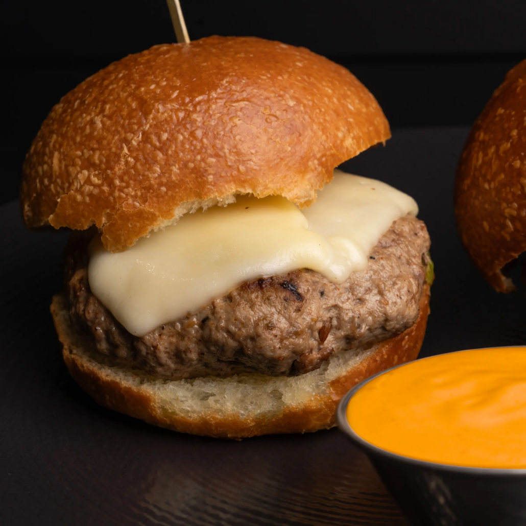 Lean grass-fed beef with Swiss cheese on made-from-scratch sourdough buns. Served with a side of Thavage Sauce.