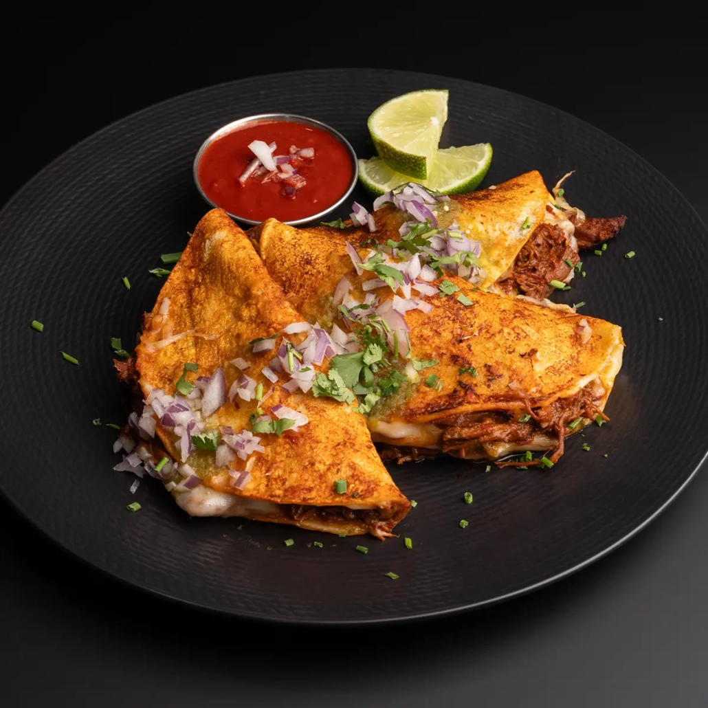 Slow-braised Angus beef cooked in rich chili spices, served in homemade corn tortillas with melted mozzarella, fresh onion, cilantro, and a squeeze of lime. Paired with a side of savory dipping sauce.