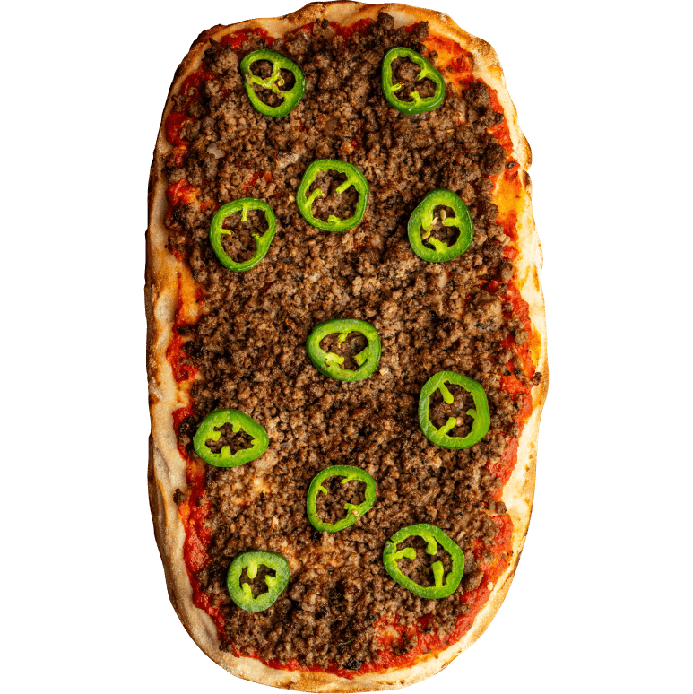 A bold, cheeseless creation loaded with lean, seasoned bison, jalapeños, and a rich tomato sauce—all on our signature Pinsa Romano crust.