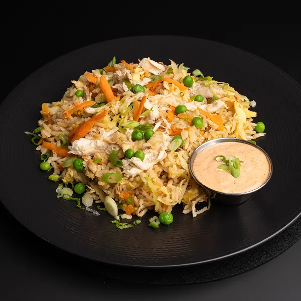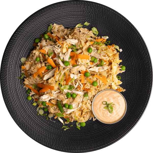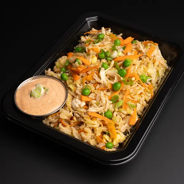 Shredded chicken breast, jasmine rice, cage-free eggs, fresh sauteed vegetables, and coconut aminos. With a side of Bum Bum sauce.