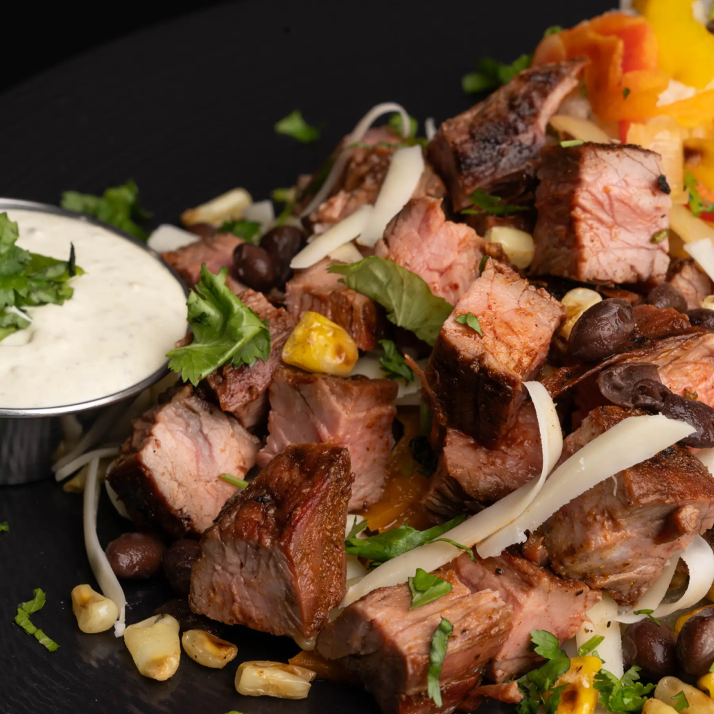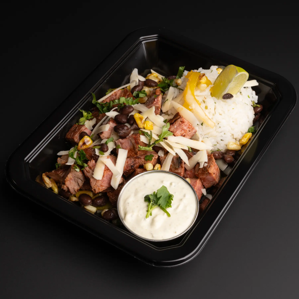 Certified Black Angus carne asada with cilantro lime rice, black beans, peppers, corn, cheddar, and smoky spices, paired with our house-made jalapeño cream sauce.