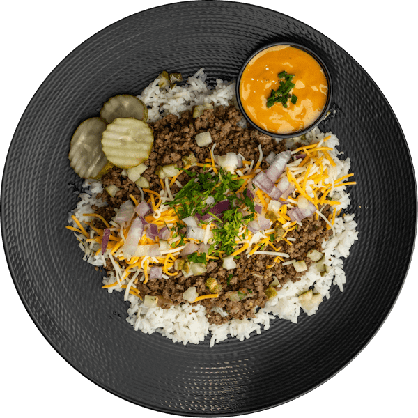 Lean ground beef sprinkled with diced onions, pickles, and cheddar jack cheese on a bed of jasmine rice. Served with a side of Boom Sauce.