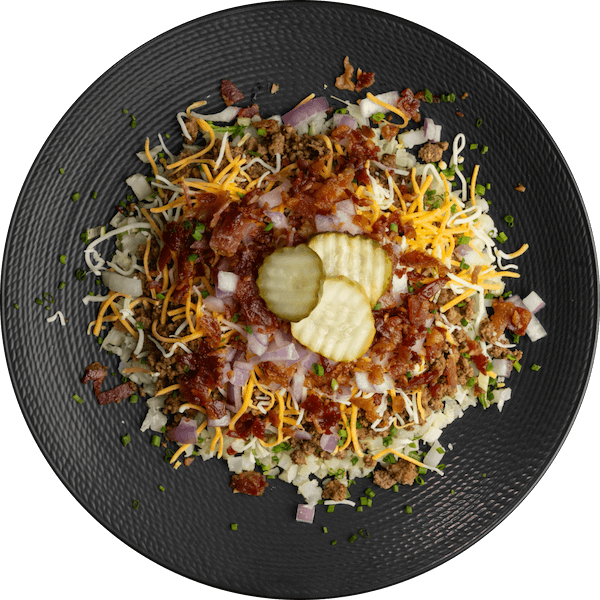Grass-fed beef on cauliflower rice, topped with pickles, red onion, melty Monterey Jack, crispy uncured bacon, and fresh chives.
