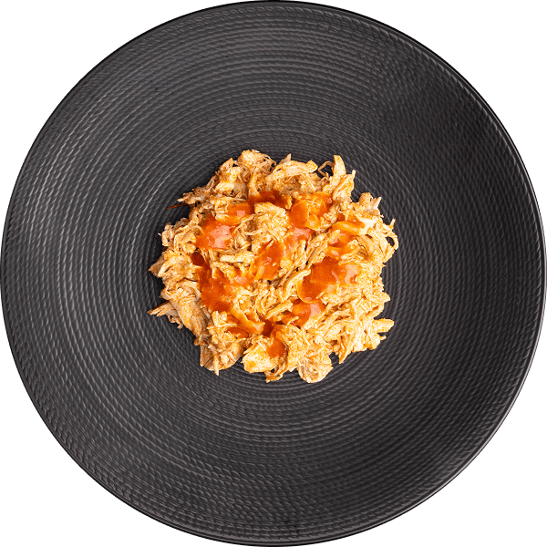Shredded chicken breast with buffalo sauce — fully cooked and sealed for peak quality.