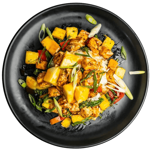 Grilled chicken breast tossed in our housemade sweet mango habanero sauce. Served on a bed of jasmine rice with fresh pineapple, red pepper and green onion.