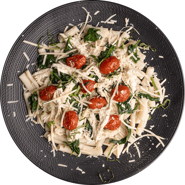 Creamy Tuscan-inspired chicken breast, cherry tomatoes, and spinach over gluten-free brown rice pasta.